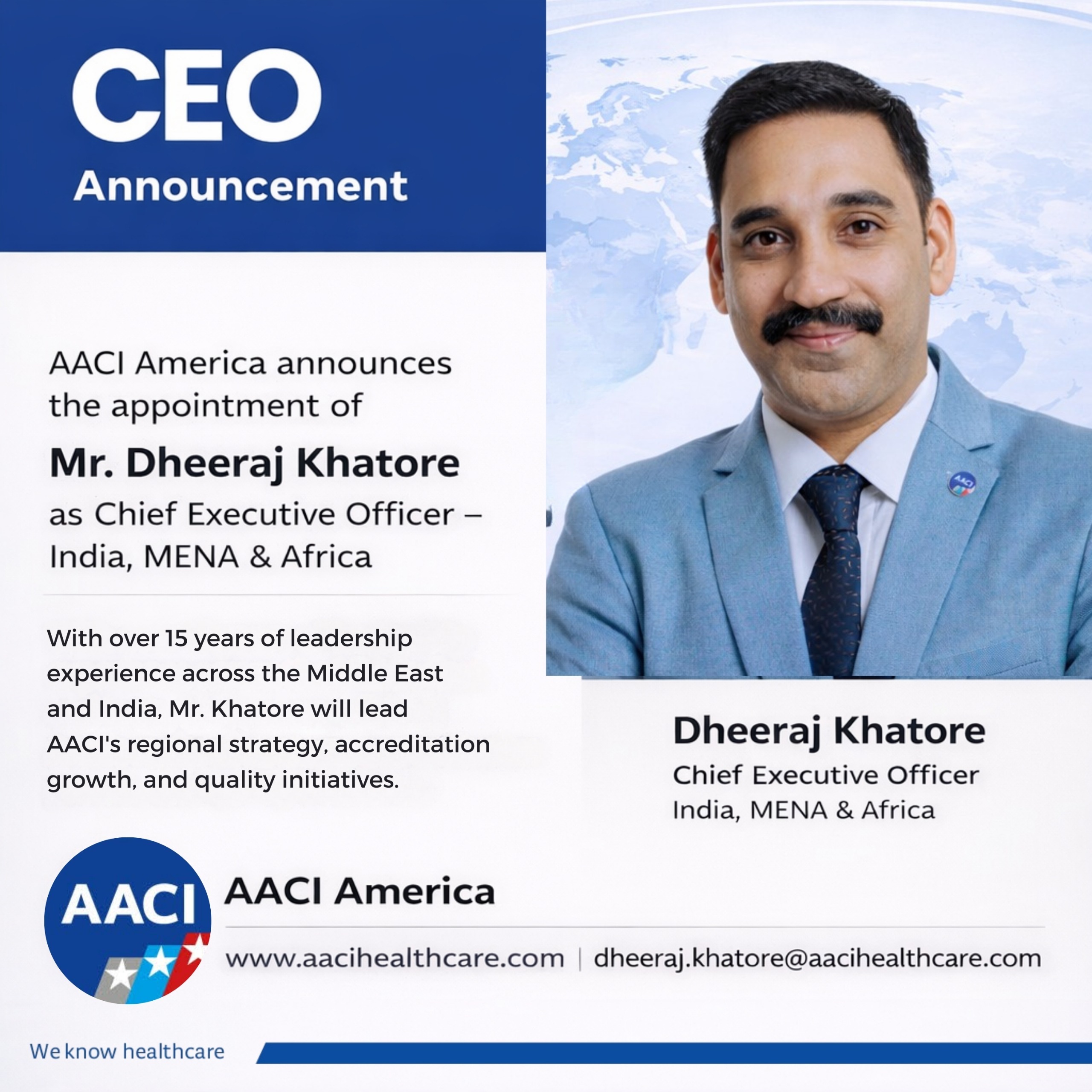 “We are proud to welcome Mr. Khatore into this important leadership role,” said Dr. John Bell, AACI President. “His demonstrated performance, regional insight, and commitment to advancing healthcare standards align perfectly with AACI’s mission to improve healthcare quality globally.”